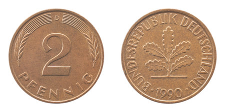 Old inactive coin 2 two pfennig 1990 West Germany BRD closeup isolated on white background
