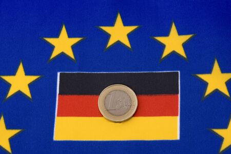 1 euro lies on dark blue surface. The coin was issued in Germany. Obverse with the image of Federal Eagle. close-up. Bright vertical illustration about European Union economy. eurozone news. Macro