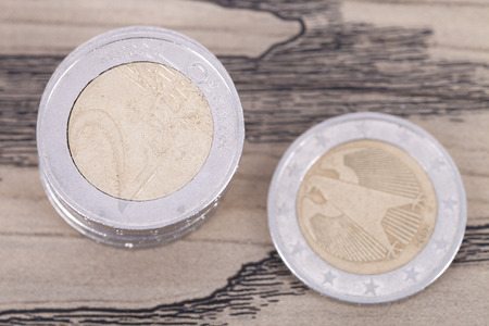 Stack of coins on the table with dark background. Still life picture taken in studio with soft-box. Euro - European currency