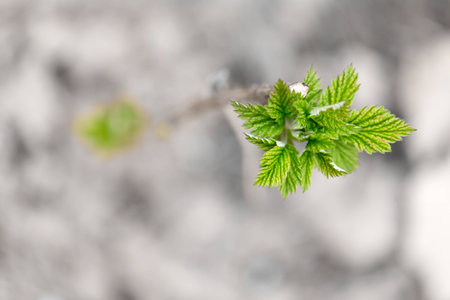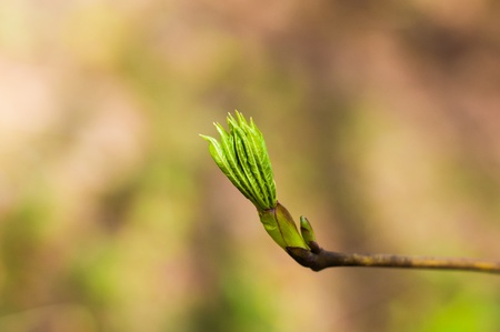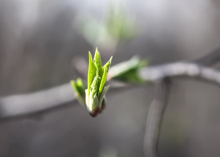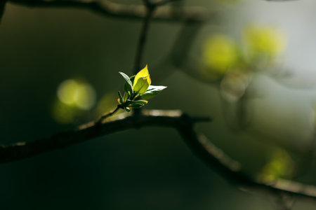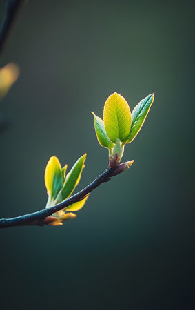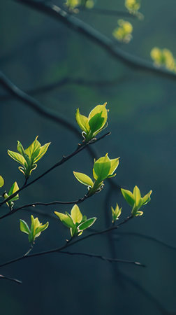 Fresh green leaves sprouting on a branch, symbolizing new beginnings and the beauty of nature in a serene environment.
