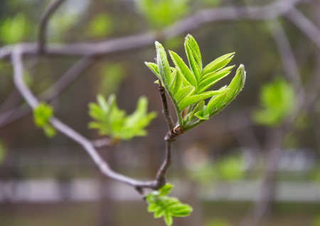 View of newly sprouted green buds on a tree branch, Freshly sprouted buds on trees