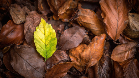 Vibrant green leaf stands out among bed of brown, dried leaves, symbolizing resilience and hope in nature. contrast highlights beauty of life amidst decay