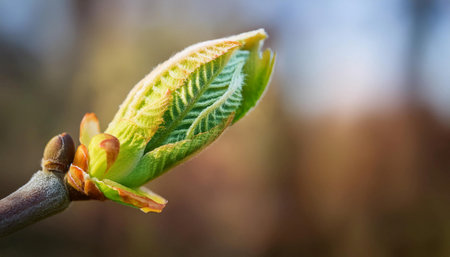 Spring Awakening Green Leaves and Bud Unfurling on Branch in Warm Sunlight, Nature Background