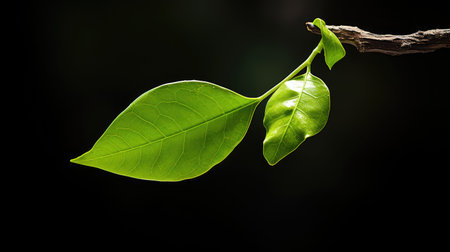 A striking studio shot showcases a delicate gradient of fresh green leaves against a deep dark black background. This natural and organic composition uses a minimal and modern aesthetic, highlighting the texture and intricate pattern of the foliage. This elegant image evokes a sense of calm and wellness, perfect for decorative projects, spa branding, or eco-friendly product design. The isolated arrangement in a flat lay top view provides ample space for text, making this abstract design ideal for diverse creative applications.