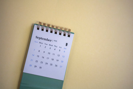 Hello, September 2025. Desktop calendar for planning on a beige background