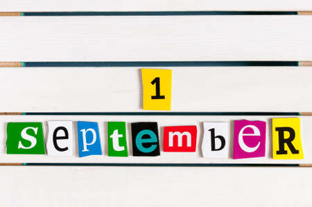 September 1st. Calendar of first or 1 day of septeber - written with color magazine letter clippings on wooden board. Back to school time..