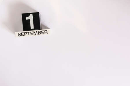 September 1st. Image of september 1 wooden black calendar on white background. Autumn day. Empty space for text. Back to school time