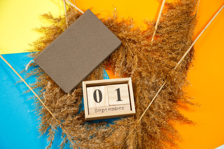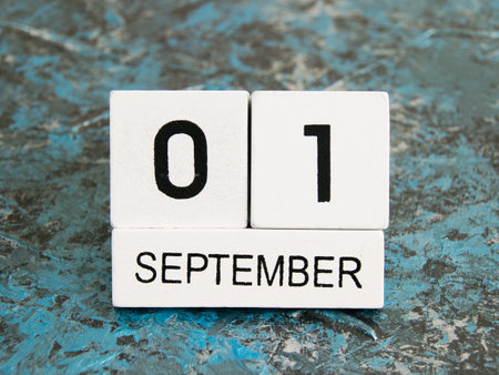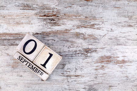 wooden calendar with numbers 1st september on the table at home