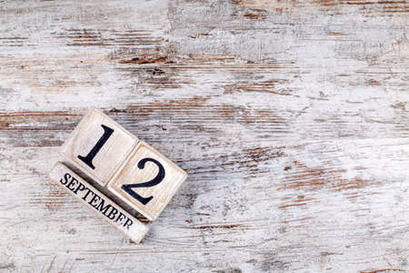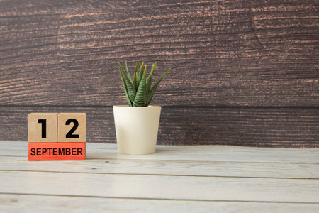 Wooden calendar with the date September 12.Monthly calendar for planning and management concept with alarm clock on wooden background