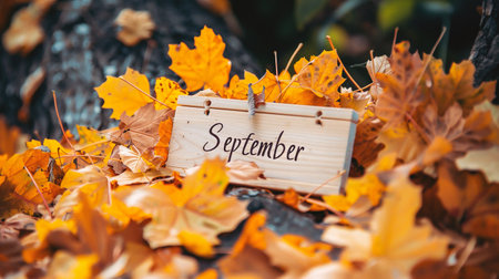 Wooden signboard with the inscription September in the autumn park.
