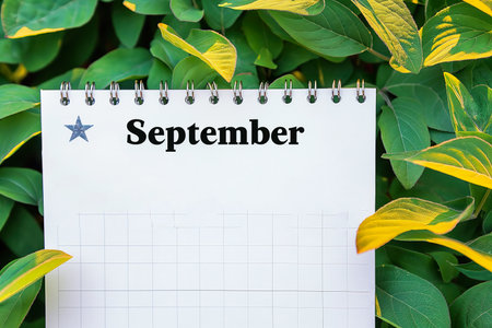 September calendar placed on a table beside green leaves.