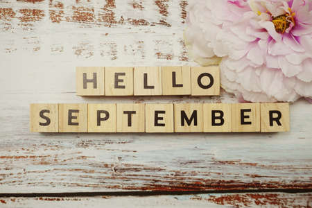 Hello September alphabet letters on wooden background