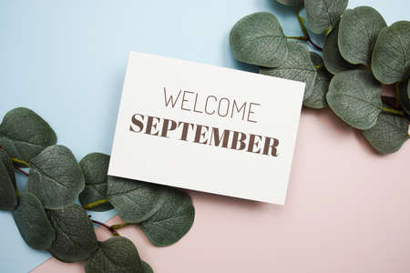 Welcome September text message with green leave on blue and pink background