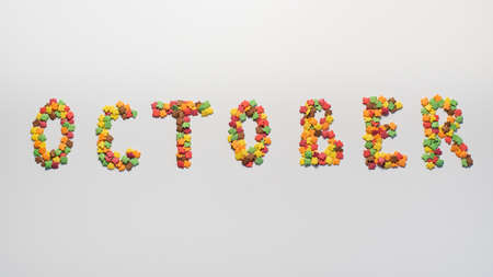 October inscription on a white background. Confectionery sprinkles in the form of multi-colored maple leaves
