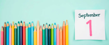 Sharpened pencils in a row with handwritten “September 1†note. Back to school.