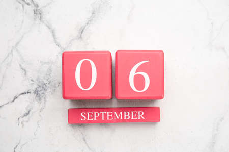 Calendar of wooden cubes with numbers and months. Notepad with white sheets. The first day of the school year. Choosing a number on a wooden calendar. September 1. September date