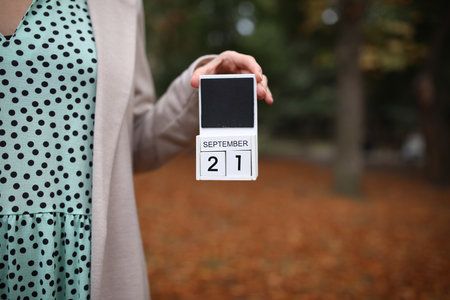 Woman holds calendar with the date September 21 outdoors.