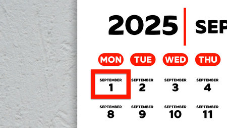 Close-up of the date September 1st marked with a red cursor on the wall calendar 2025