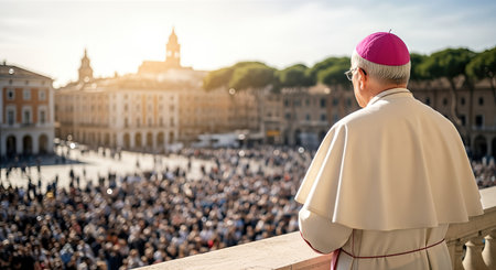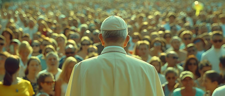 Religious leader in ceremonial attire gazes at large crowd gathered in prayer, with sunlight illuminating the scene, symbolizing unity and devotion during a significant religious event