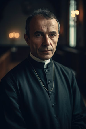 Portrait of a catholic priest looking at camera in church.