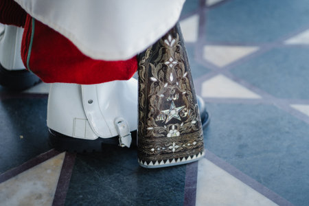Close-up of an ornate rifle butt beside polished boots, suggesting a ceremonial guard on duty. Traditional craftsmanship, formal stance, and symbolic military detail in a public space.