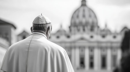 A religious leader in white robes approaches St. Peter's Basilica, showcasing the majestic architecture. The atmosphere is serene, reflecting a moment of contemplation and faith