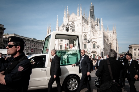 MILAN, ITALY - MARCH 25, 2016: His Holiness Pope Francis meets the pilgrims after the prayer during his first visit in Milan.