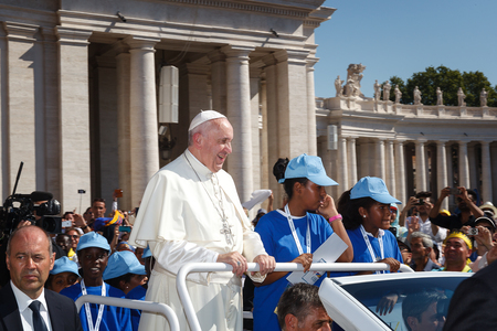 Vatican, Italy - September 3, 2016: Pope Francis on the new mobile pope, surrounded by a crowd of faithful in St. Peter's Square.