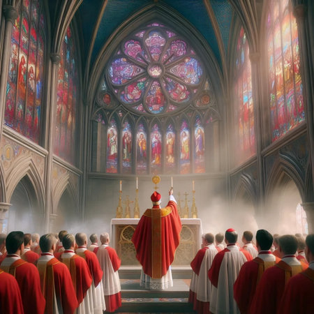 A significant religious ceremony takes place featuring a leader in elaborate robes and a congregation of clergy members observing solemnly.