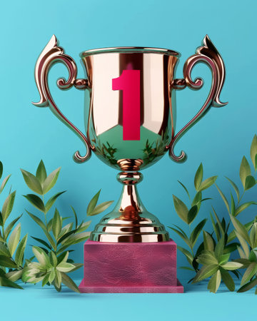 A vibrant image of a golden trophy surrounded by festive streamers against a striking blue background. This design embodies the spirit of business success, competition victories, and the