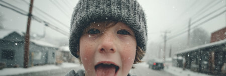 A young boy in a gray hat sticks his tongue out in delight as snowflakes fall around him in a quaint town during a winter day.