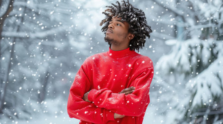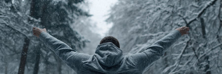 Individual stands in a serene snow-covered forest, arms wide open, soaking in the peaceful snowfall and enjoying the beauty of winter scenery.