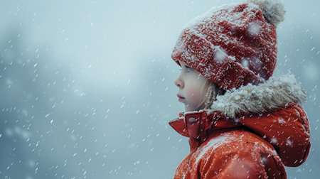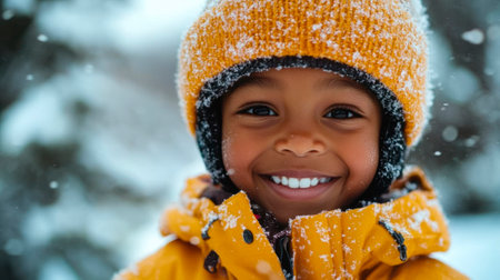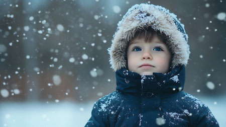 A young child enjoys a playful moment in the snow on a winter afternoon. They wear a warm hat and a coat, surrounded by falling snowflakes with a bright smile.