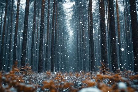 Cinematic photograph of a pine forest in winter, with snow falling, tall trees, and moody, cold tones. --ar 3:2 --v 6.1 Job ID: 21d46340-f402-427b-adeb-09973bf6bec0