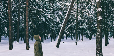 Portrait of a beautiful young woman in a warm jacket and hat in a snowy forest