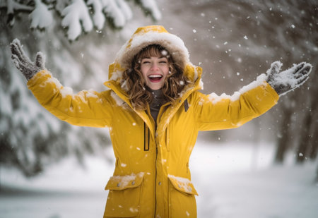 Generative AI : happy girl laughing enjoying life and throws snow at winter outdoors