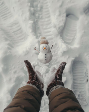 Adult's hand holding snowman, legs in white sneakers on snowy ground, top view.
