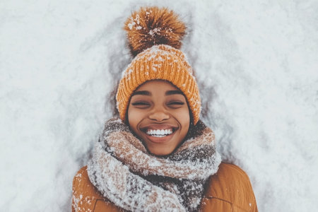Joyful winter scene: smiling woman with warm clothes lying on snow-covered ground.