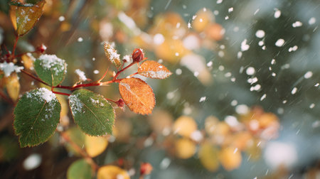 First snow falling gently, a few snowflakes drifting slowly and settling on the leaves; fresh air.