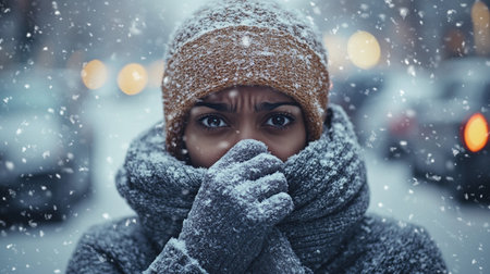 Individual in warm scarf and hat surrounded by falling snow in a chilly winter setting during nighttime