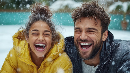 A Couple laughing joyfully in snow, enjoying playful winter moment