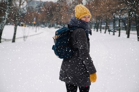 Happy young european woman in a yellow knitted hat and mittens with a backpack, laughs and leaves under the snowfall. View from the back. Retro effect. Blur
