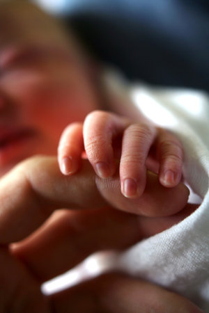Newborn baby tiny hand gently grasps a parent finger in a hospital bassinet, symbolizing new life, love, and bonding. A tender moment of connection and care.