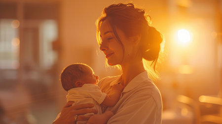 A tender moment captured as a mother gazes at her newborn baby with love and affection, bathed in warm sunlight filtering through a window.
