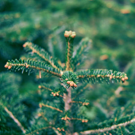 Close up of a pine cone or fir cone in a conifer tree at a Christmas tree farm. Background of Christmas tree branches. detail of branch of a young pine treepine cones on a branch. Photo toned