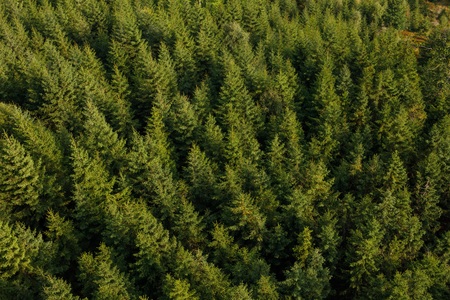 An overhead view reveals a dense forest, dominated by evergreen trees in various shades of green. The composition highlights the texture of the foliage and its layered arrangement. The style suggests a natural environment suitable for environmental concepts or background use, conveying a sense of serenity.