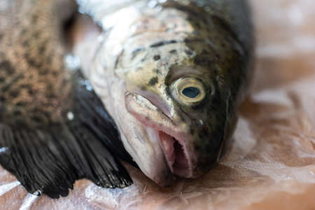 Rainbow trout head and eye close up macro shot on transparent foil set on wooden kitchen board 2020