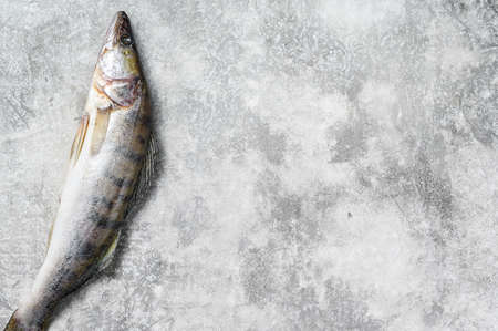 Fresh pike perch, pikeperch. Raw fish. Gray background. Top view. Copy space