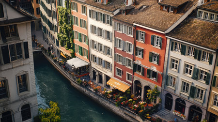 A stunning view of a serene canal lined with colorful historic buildings, outdoor dining options, and vibrant flower displays, perfect for a relaxing day.