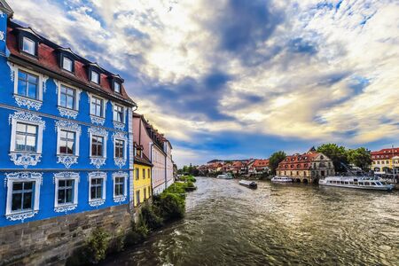Bamberg Little Venice District in Summer. Lovely historical houses at the rhiver Regnitz with blue. Hot summer evening